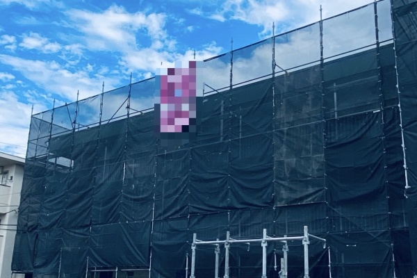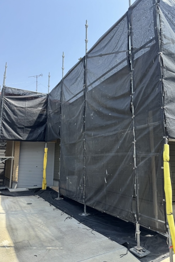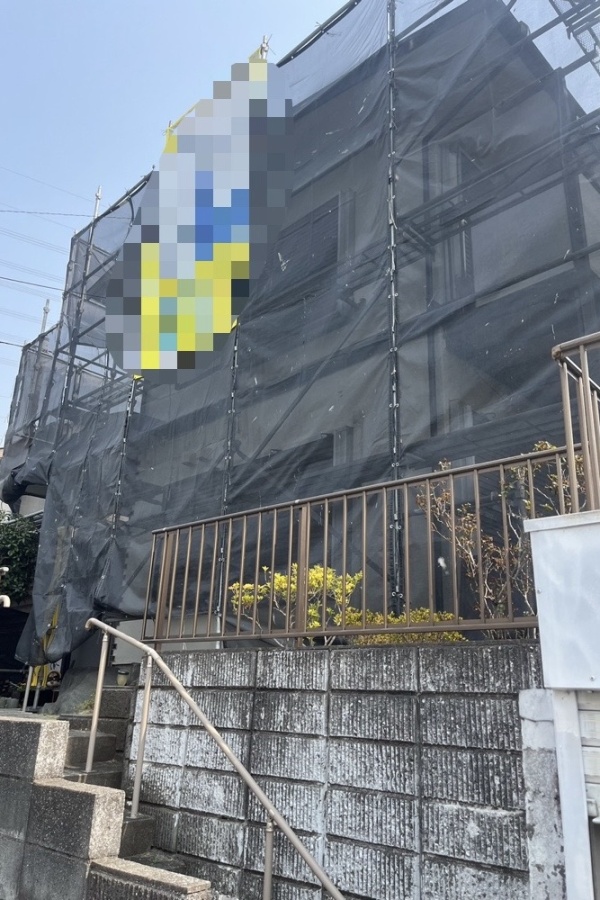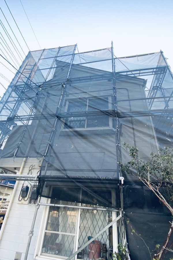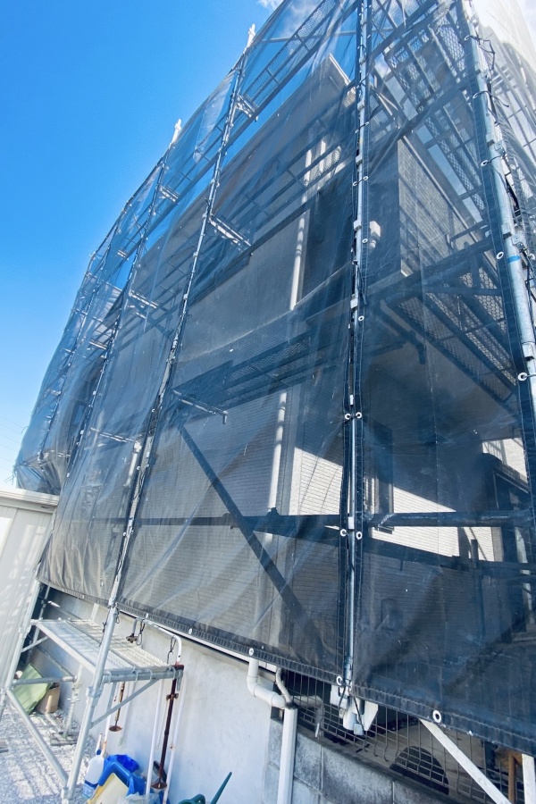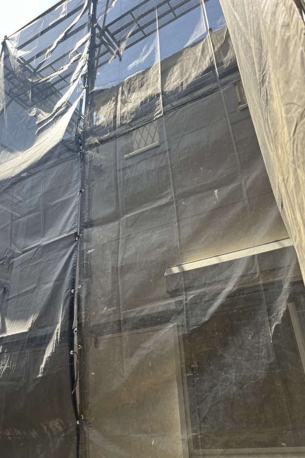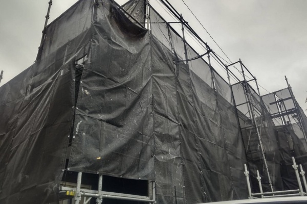 施工内容:外壁用足場架設、養生シート、朝顔養生(ラッセルネット)