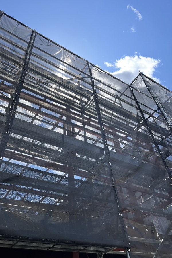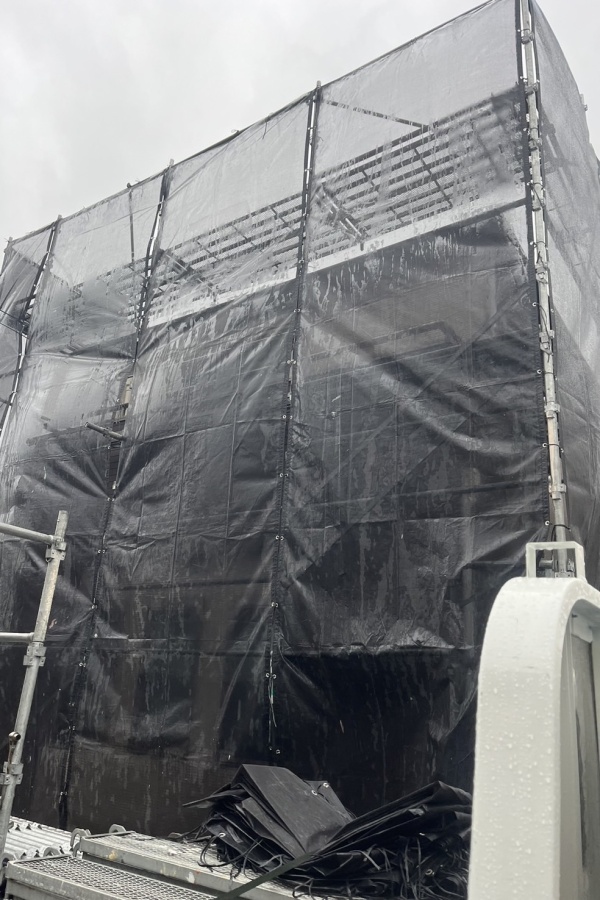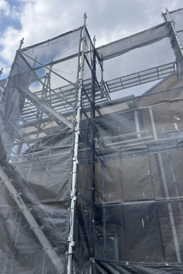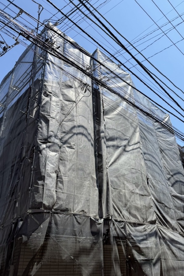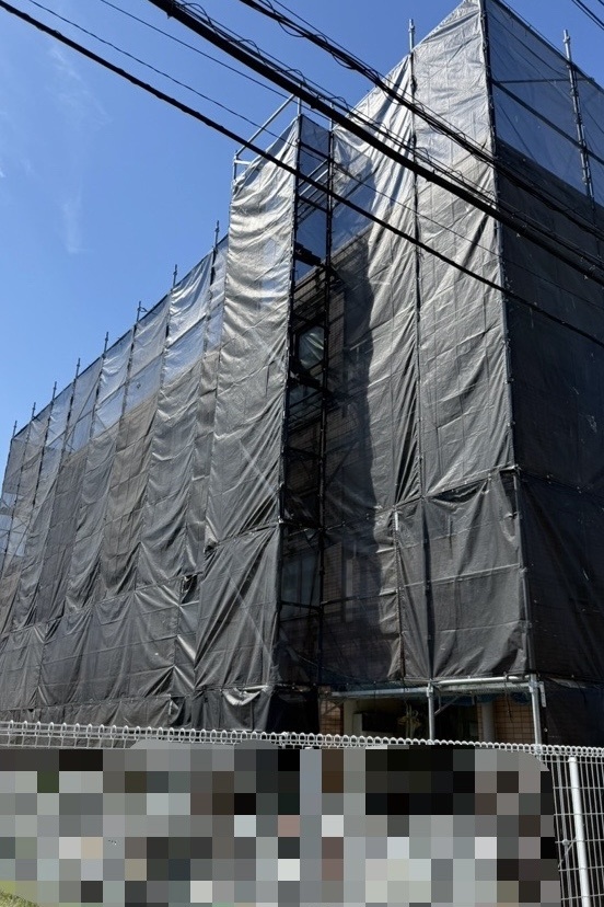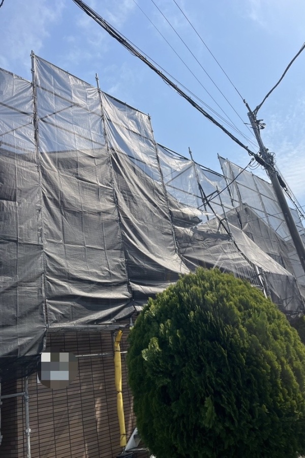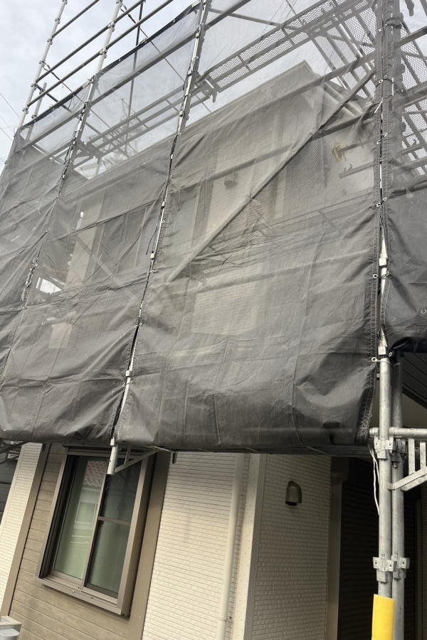 施工内容:外壁用足場架設、養生シート、朝顔養生(ラッセルネット)