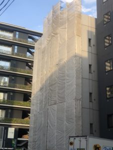 東京都港区において、7F建てビルのシール打ち替えと外壁塗装工事の足場を架設しました❕❕