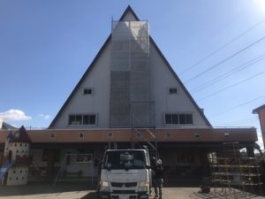 埼玉県富士見市において、幼稚園の屋根部分に部分架け足場を架設しました❕❕