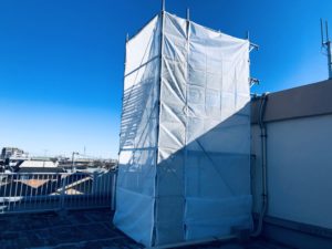 いつもの外壁塗装や屋根塗装工事とは違い屋上のみの防水工事という事で、昇降用と荷揚げ用の部分架け足場で対応しました🙋