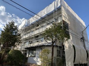 東京都世田谷区において、3F建てアパートの軒部分の瓦撤去・改修工事の為の足場を施工しました❕❕
