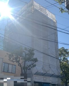 東京都江戸川区において、5F+塔屋のビルの外壁塗装工事・屋上防水工事のための足場を施工しました❕❕