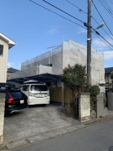 東京都八王子市において、2F建て住宅屋根・外壁・全塗装工事の足場を架設しました❕❕