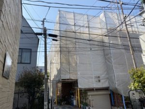 東京都新宿区において、3F建てアパートの外壁塗装工事のための足場を施工しました❕❕