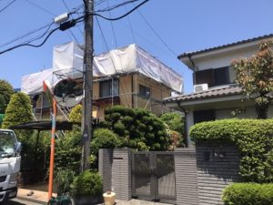 東京都日野市において、2F建て住宅の屋根葺き替え工事の足場を施工しました❕