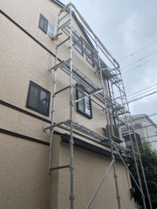 建ち上がるまで足場が倒壊しないようにアウトリガーを使って組ませていただき、