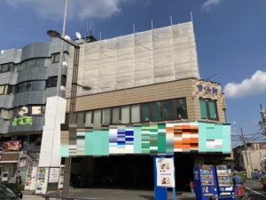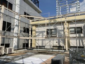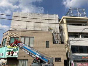 東京都羽村市において、ビルの看板撤去・鉄骨塗装工事の為の足場を架設しました❕