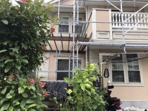 屋根塗装工事があるため軒先アンチを入れさせて頂き、足場の倒壊防止のためのはさみ込みをして足場補強を十分にしました🙋