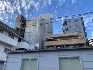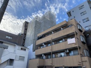 東京都世田谷区において、8F建てビルの改修工事のための足場を施工しました❕❕