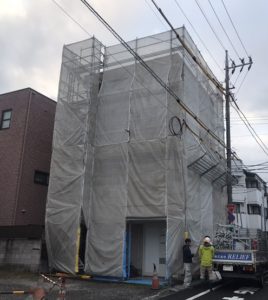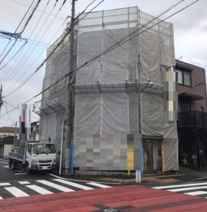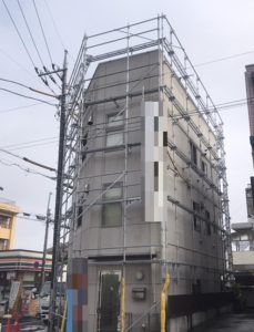 東京都板橋区において、3F建て店舗の内外装工事のための足場を施工しました❕❕