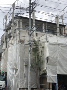 台風で強風が来るかもしれなという事を想定してメッシュシートを足場柱に巻き付けをして風通しができるように設置しました。