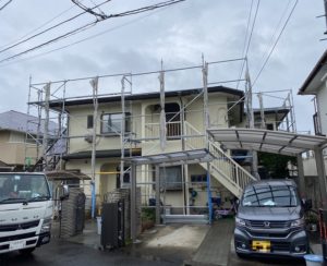 神奈川県藤沢市において、2F建て住宅の屋根カバー工法・外壁塗装工事のための足場を施工しました❕❕