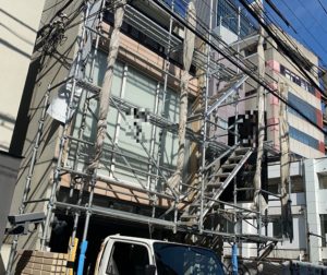 東京都渋谷区において、3F建て店舗の正面の改修工事のための足場を施工しました❕❕