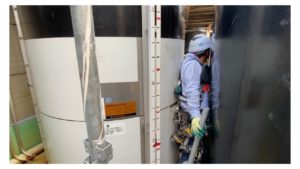 タンクの奥で職長さんに待機して頂き、子方が狭い箇所を気をつけながら材料を受け渡す・・・