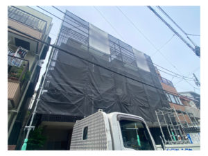 ※隣接している面が狭くない場合は、安全や改修する職人さんの効率の関係で、各々の建物に足場を架設します。