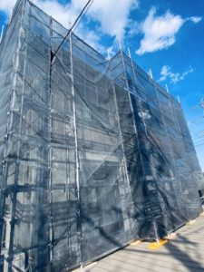この足場を覆っている黒いシートこそが、メッシュシートです💡