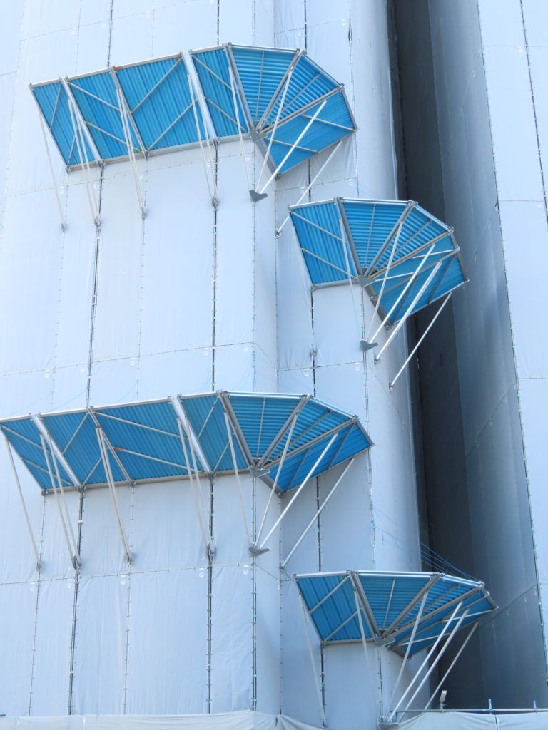 朝顔とは、道路などに面した工事現場で足場から突き出た状態で設置し、