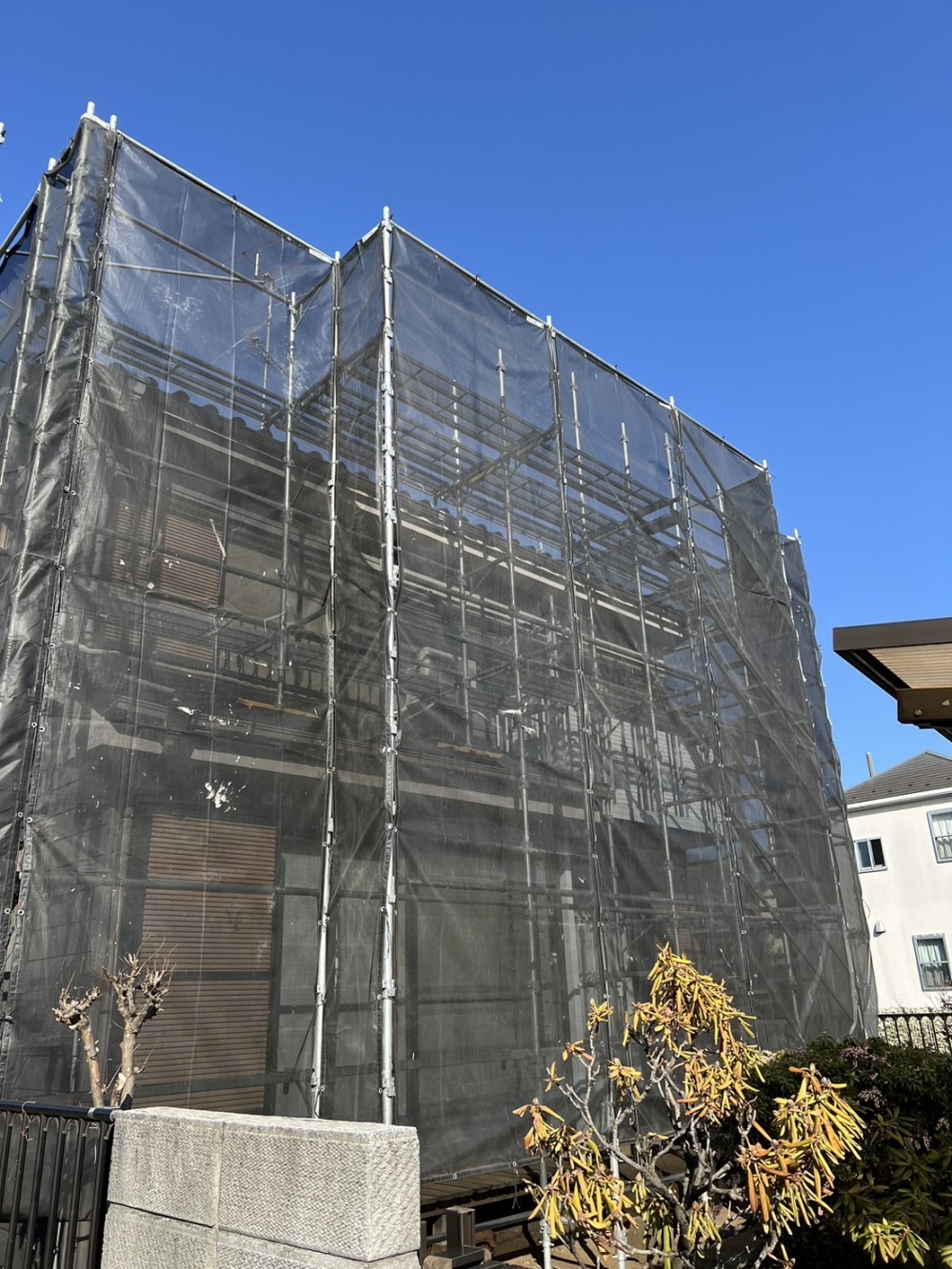 住所:東京都府中市施工内容:戸建足場架設工事用途:屋根葺き替え工事・軒樋交換工事・塗装工事に伴う足場架設工事先日、東京都府中市にて戸建足場架設工事を行い2人で約5時間で無事に作業終了いたしました。K様、ご依頼をいただきありがとうございました。