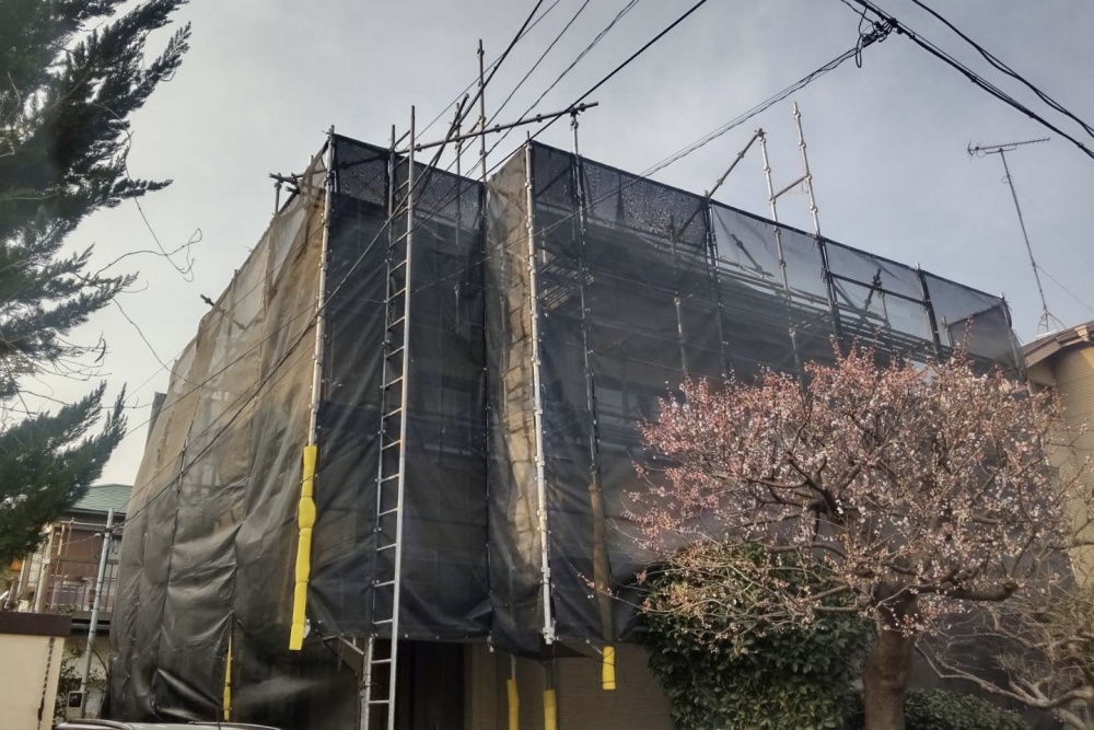 先日、千葉県浦安市にて、戸建(241m²)足場架設工事を行いました。 2名作業で、約4時間にて無事作業終了いたしました。