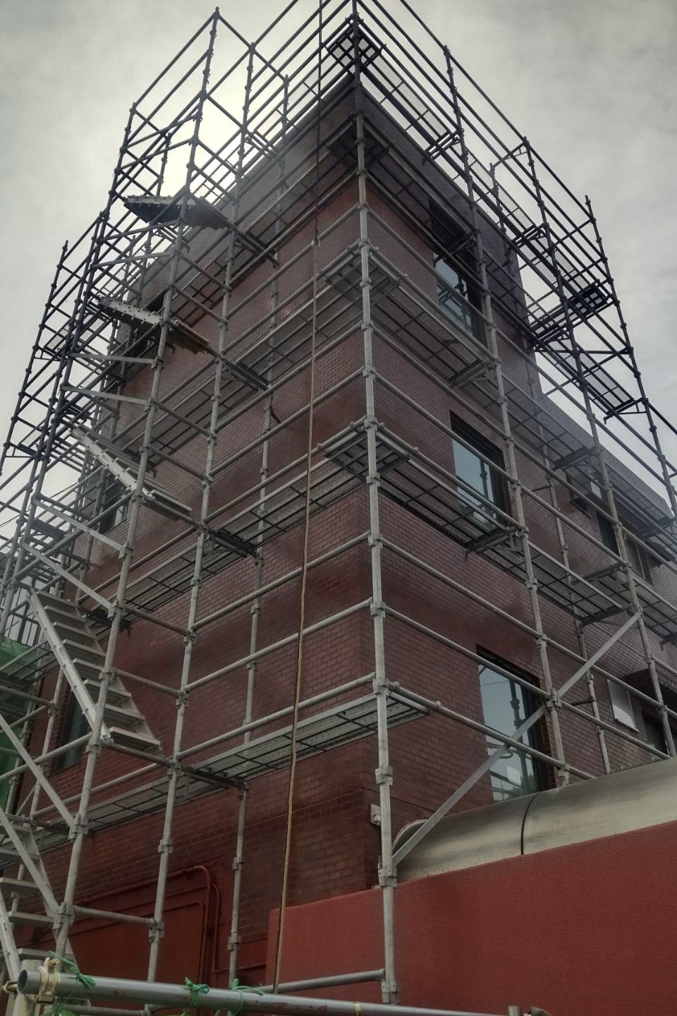 住所:東京都渋谷区施工内容:ビル足場建架設工事用途:外壁塗装に伴う足場架設工事
