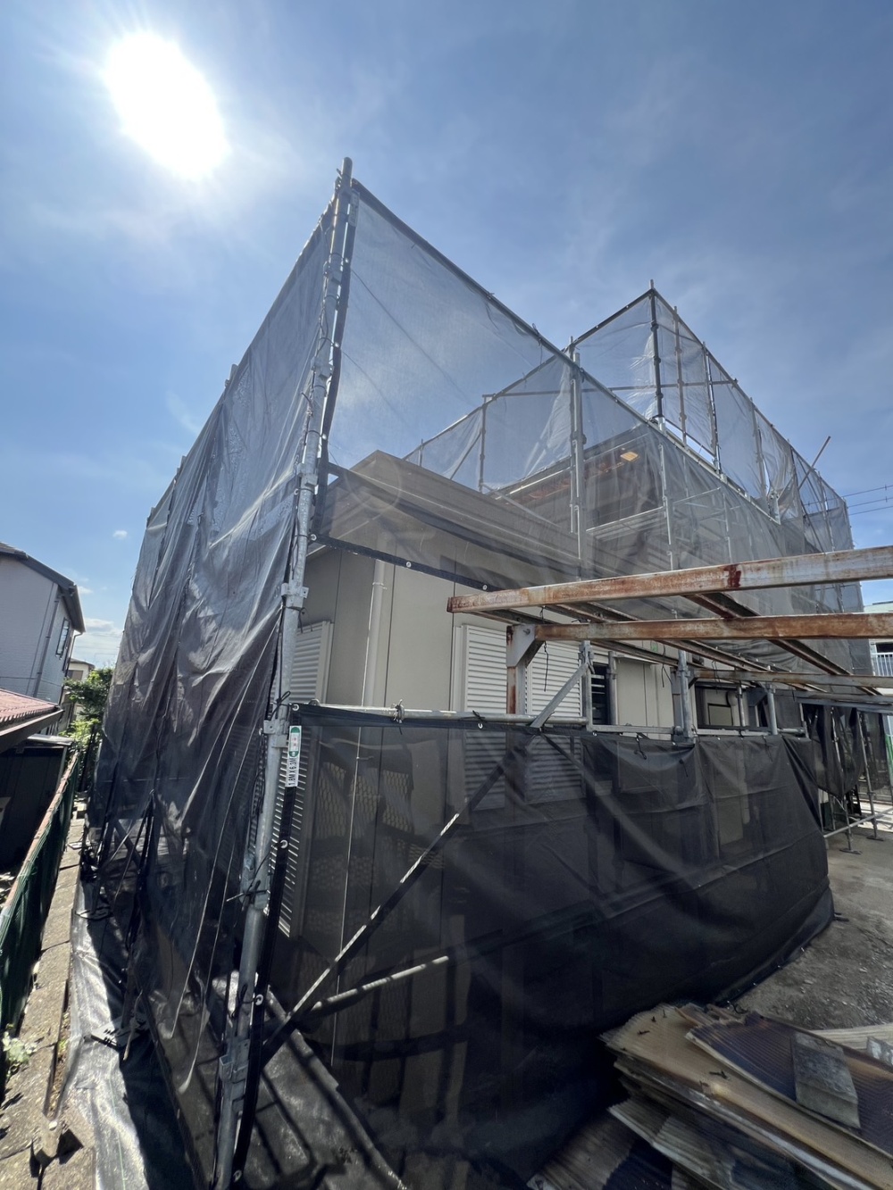 住所:埼玉県日高市施工内容:戸建足場建架設工事用途:外壁塗装に伴う足場架設工事