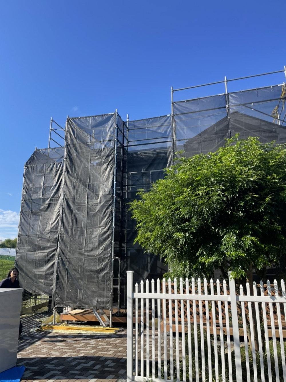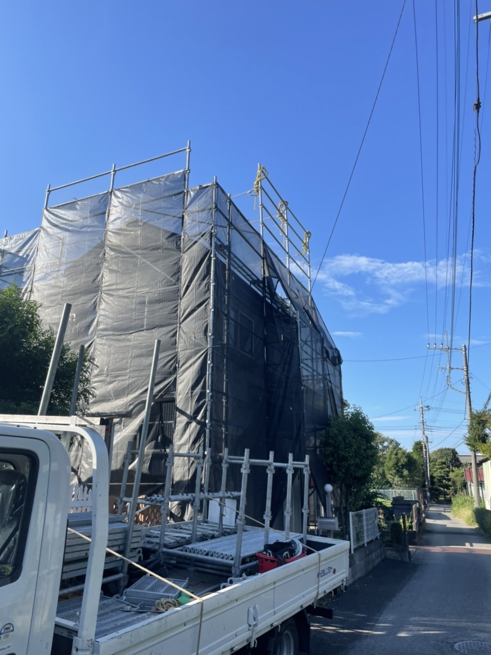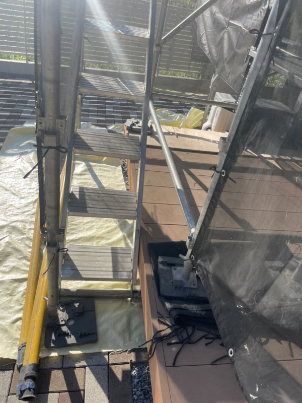 住所:千葉県流山市施工内容:戸建て足場架設工事用途:防水・塗装工事に伴う足場架設先日、千葉県流山市にて戸建て足場架設工事を行いました。下屋部分に敷板を設置し、傷や汚れがつかないようさせていただきました。また、弊社で課題となっている昇降階段の1段目が、あまり高くなりすぎないよう設置させていただきました。2人作業で無事作業終了です。